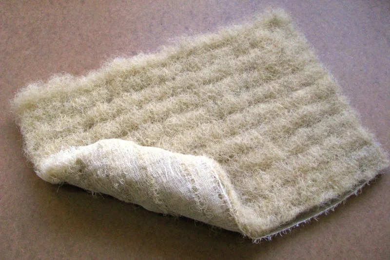 Description: SH tight twisted is untwisted by maschine and blown up to a lightly needled pad with gauze as backing.